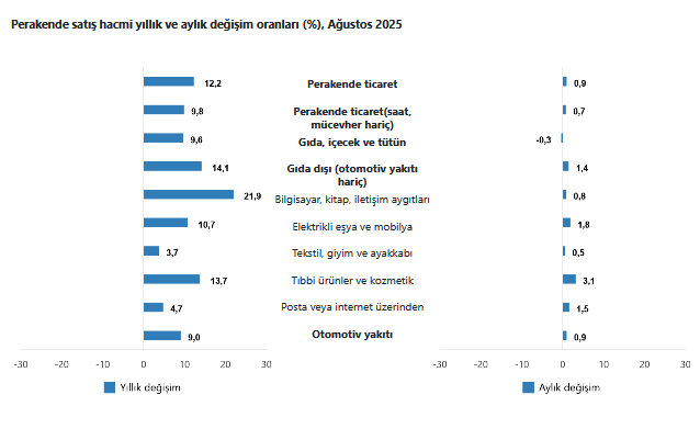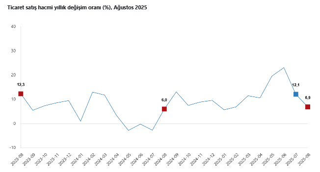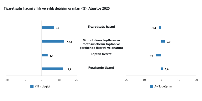 Türkiye İstatistik Kurumu’nun verilerine göre, ticaret satış hacmi Ağustos'ta yıllık bazda yüzde 6,9 arttı. Aynı ayda motorlu kara taşıtlarının ve motosikletlerin toptan ve perakende ticareti ile onarımı için satış hacmi yüzde 12,8, toptan ticaret satış hacmi yüzde 3,4, perakende ticaret satış hacmi ise yüzde 12,2 arttı.