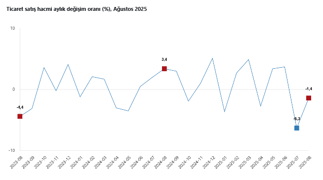 Ticaret satış hacmi, Ağustos'ta aylık bazda yüzde 1,4 azaldı. Aynı ayda motorlu kara taşıtlarının ve motosikletlerin toptan ve perakende ticareti ile onarımı için satış hacmi yüzde 2,0 artarken, toptan ticaret satış hacmi yüzde 3,1 azaldı, perakende ticaret satış hacmi ise yüzde 0,9 arttı.